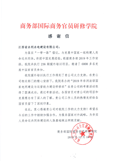 2019年,公司圍繞國家和我省“走出去”戰(zhàn)略,積極配合商務(wù)部及省內(nèi)援外培訓(xùn)工作,得到各方認(rèn)可。近日,公司收到來自商務(wù)部國際商務(wù)官員研修學(xué)院的感謝信,信中提到,商務(wù)部研修學(xué)院援外培訓(xùn)工作得到我公司的大力支持,“2019年非洲法語國家電網(wǎng)建設(shè)與運營能力建設(shè)研修班”考察、交流活動取得圓滿成功,對公司的積極配合表示衷心感謝。
